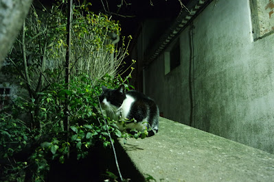 Avec bien sur le proprio qui est toujours proche. Nous profitons pour prendre l'air avant le repas du soir et juste avant d'aller se coucher. Toujours sur son mur sacré, incontournable Patatine...